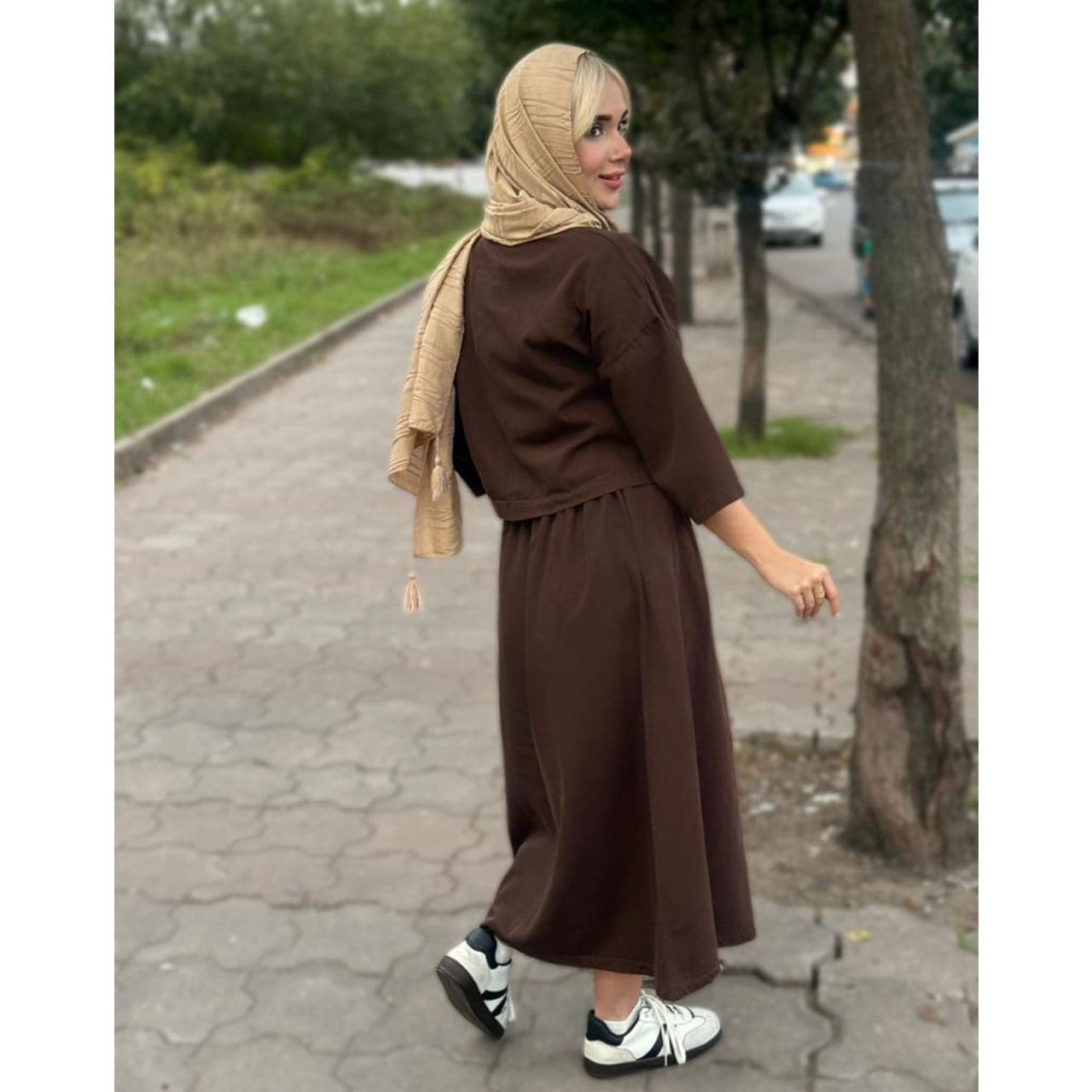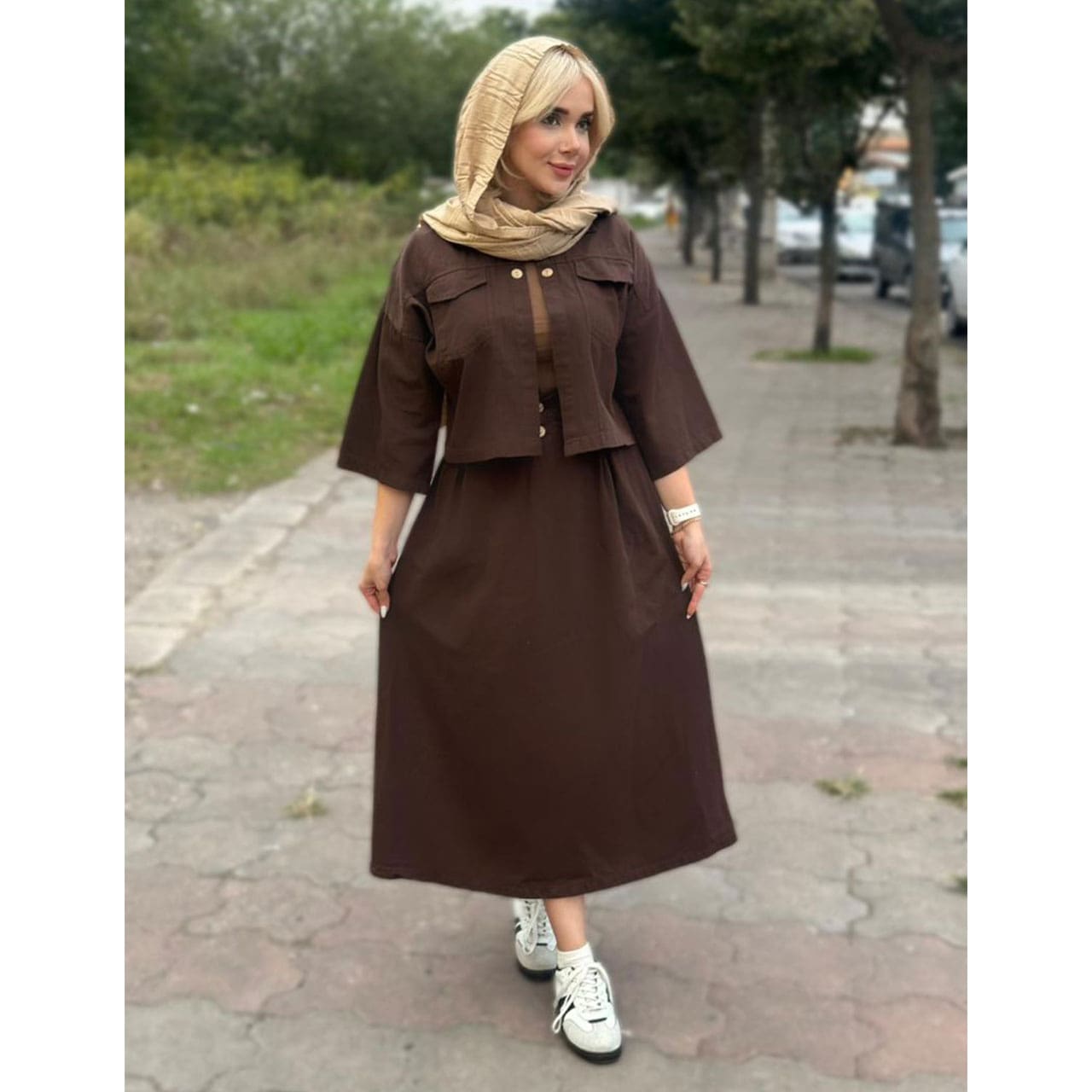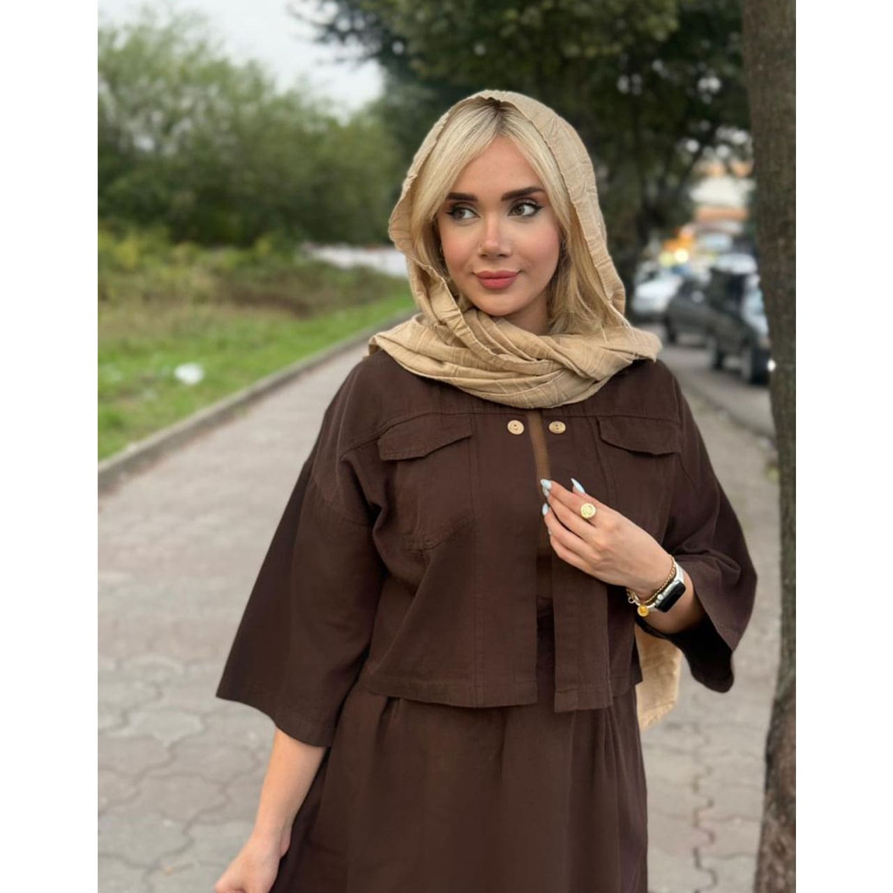 جنس : پارچه کتان مناسب فصل سایز : فری سایز مناسب سایز 38 الی 44 قد کت : 55 قد دامن : 90